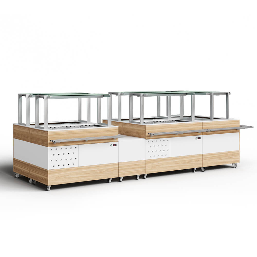 Корпус фуд-бара изготовлен из нержавеющей стали. Витрина оснащена закаленным стеклом, которое крепится на кронштейне из нержавеющей стали. Помимо защитной функции, на витрину по желанию можно установить декоративные элементы, одноразовую посуду или другие нетяжеловесные предметы. Также витрина оснащена LED подсветкой, что позволит потребителям комфортно пользоваться салат-баром.