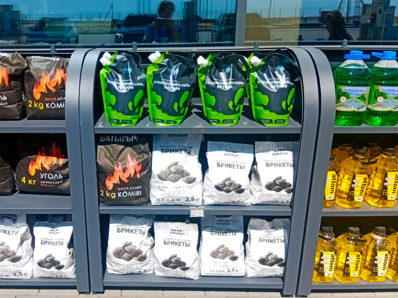 Установлены удобные и прочные пристенные и островные стеллажи, а также уличные экспозиторы, позволяющие эффективно организовать выкладку широкого ассортимента сопутствующих товаров.