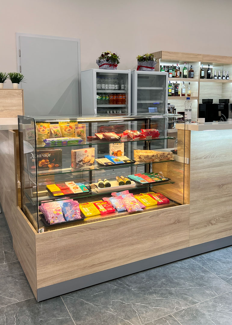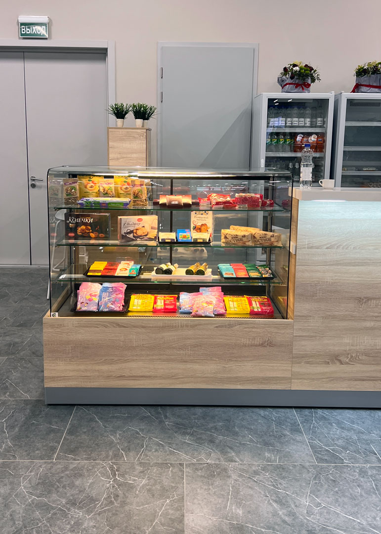 Расчетно-кассовая стойка (РКС) Хотколд (3300×1200×1200 мм) – завершает линию обслуживания, обеспечивая удобное размещение кассового оборудования и комфортное взаимодействие с посетителями.