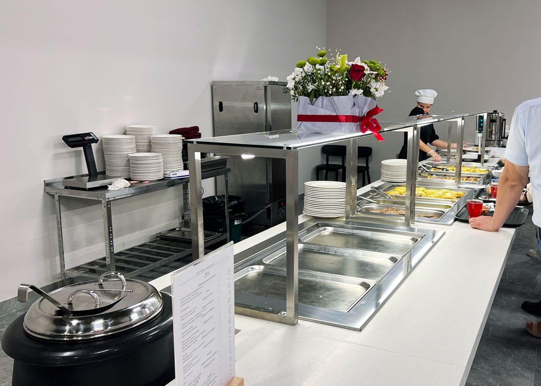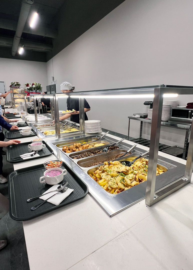 Для организации потока посетителей и эффективной выдачи готовых блюд была спроектирована и смонтирована модульная линия раздачи, включающая следующие элементы: