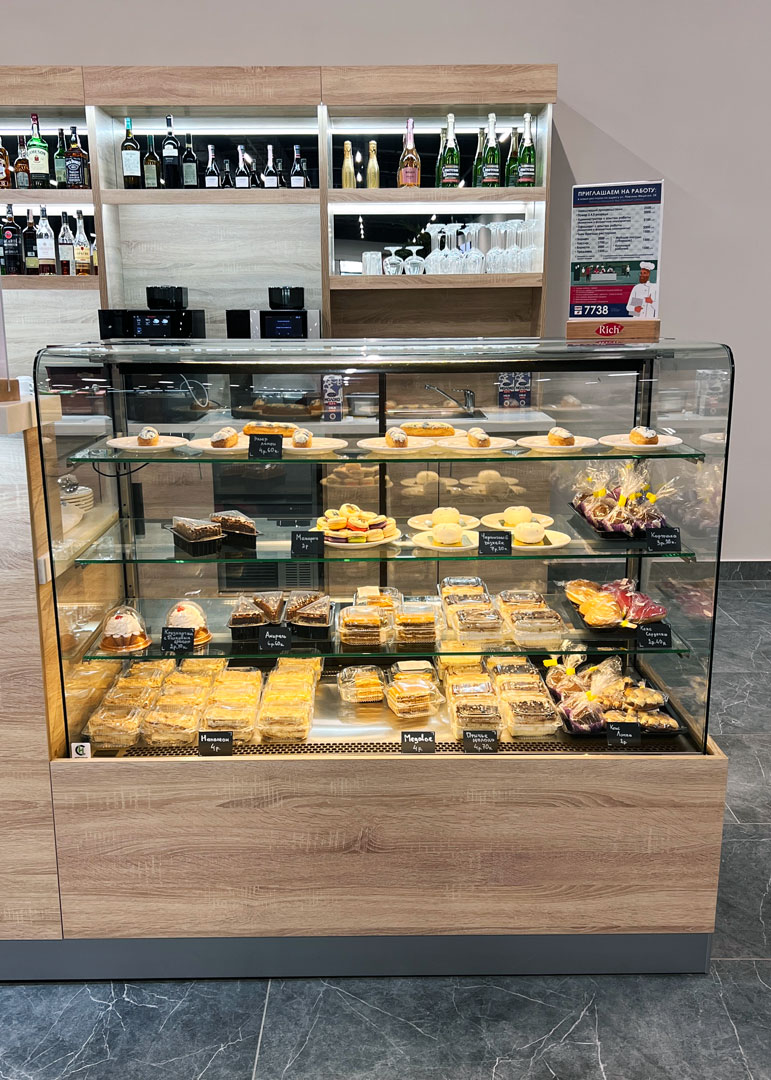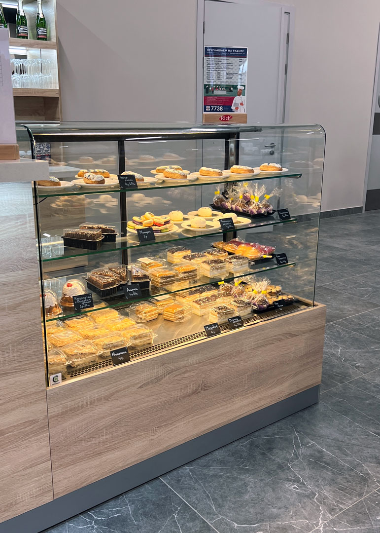 Витрина кондитерская Хотколд CANARY 1300 с гнутым стеклом – для демонстрации десертов, выпечки и тортов в зоне самообслуживания.